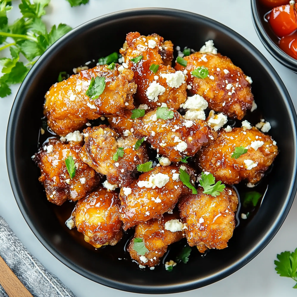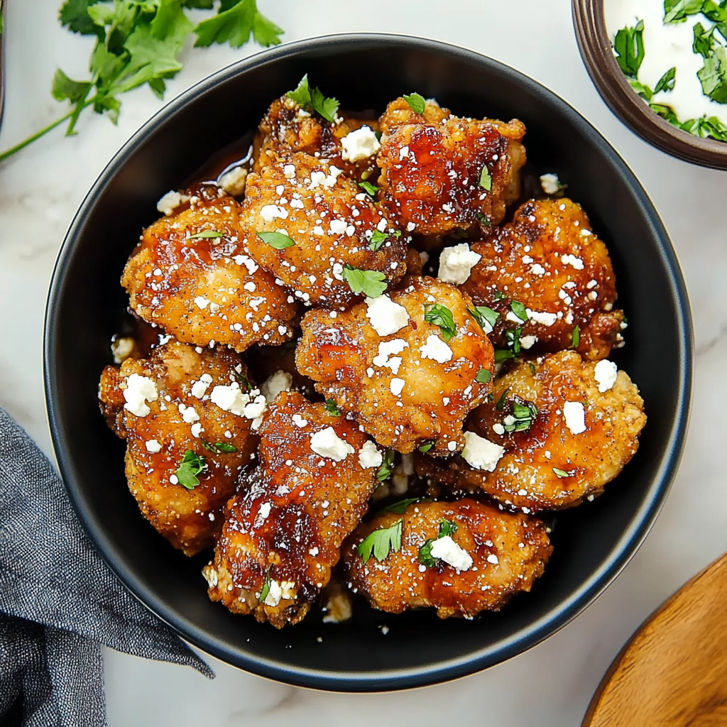 • Crumbled feta cheese – A touch of creamy feta on top enhances flavor and adds a beautiful contrast to the crispy chicken.