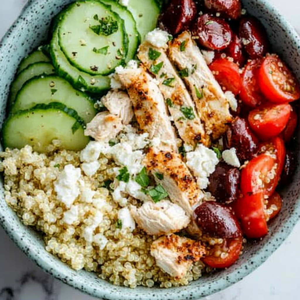 4. Assemble bowls: Layer cooked quinoa at the bottom; top with sliced chicken, diced vegetables, olives, feta cheese, and drizzle with tzatziki sauce.