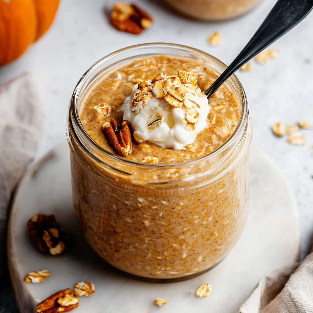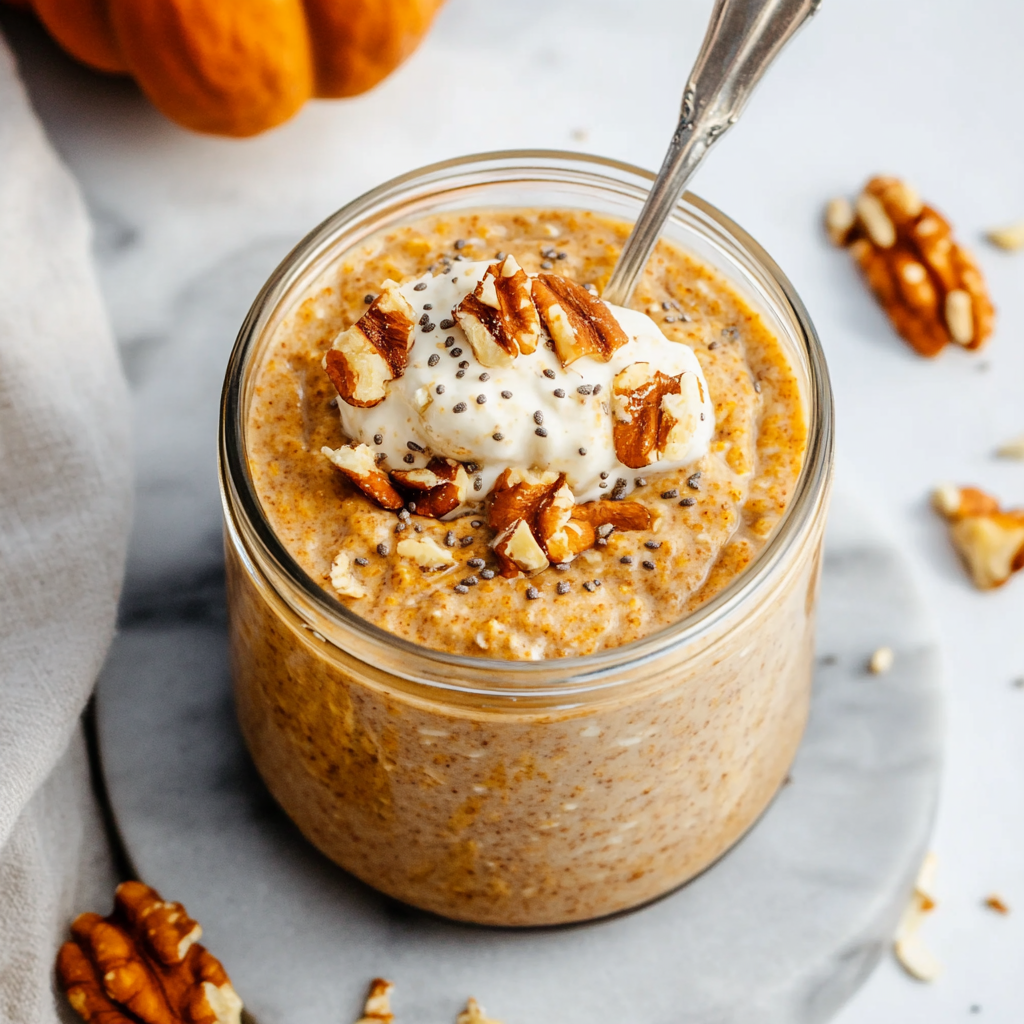 Toppings like chopped pecans, walnuts, or a dollop of whipped cream (non-dairy options available) add great texture and flavor. You can also sprinkle extra pumpkin pie spice for an aromatic finish!