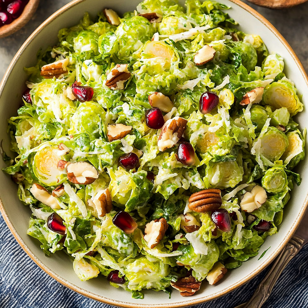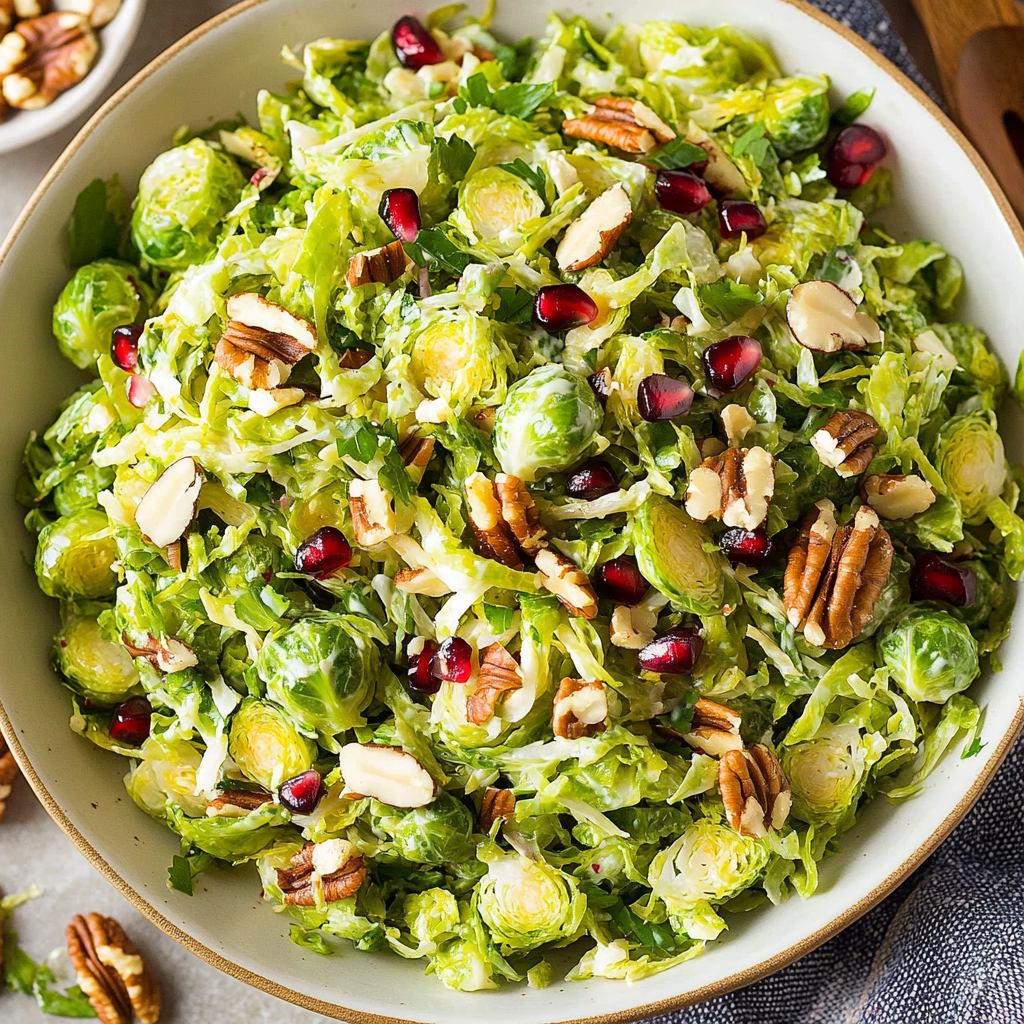 - In a large bowl, mix the shaved Brussels sprouts with the pomegranate arils, diced apples, dried cranberries, and pecans. Drizzle with vinaigrette and toss gently.